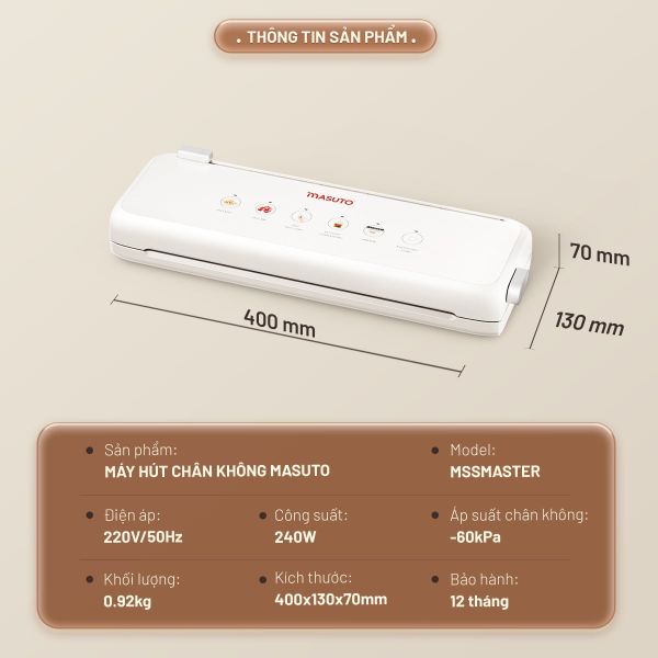 Với mức công suất 240W mạnh mẽ, thiết kế dễ vệ sinh và khả năng khóa tươi thực phẩm gấp 2 lần, Masuto không chỉ là một thiết bị điện gia dụng, mà là một khoản đầu tư cho sức khỏe của cả gia đình.