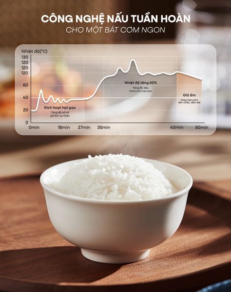 Nhiệt độ được tăng nhẹ, mô phỏng bước ngâm gạo thủ công giúp hạt gạo hấp thụ đủ nước từ trong ra ngoài giúp cơm chín mềm, không nứt, giữ trọn vị ngọt tự nhiên của gạo.