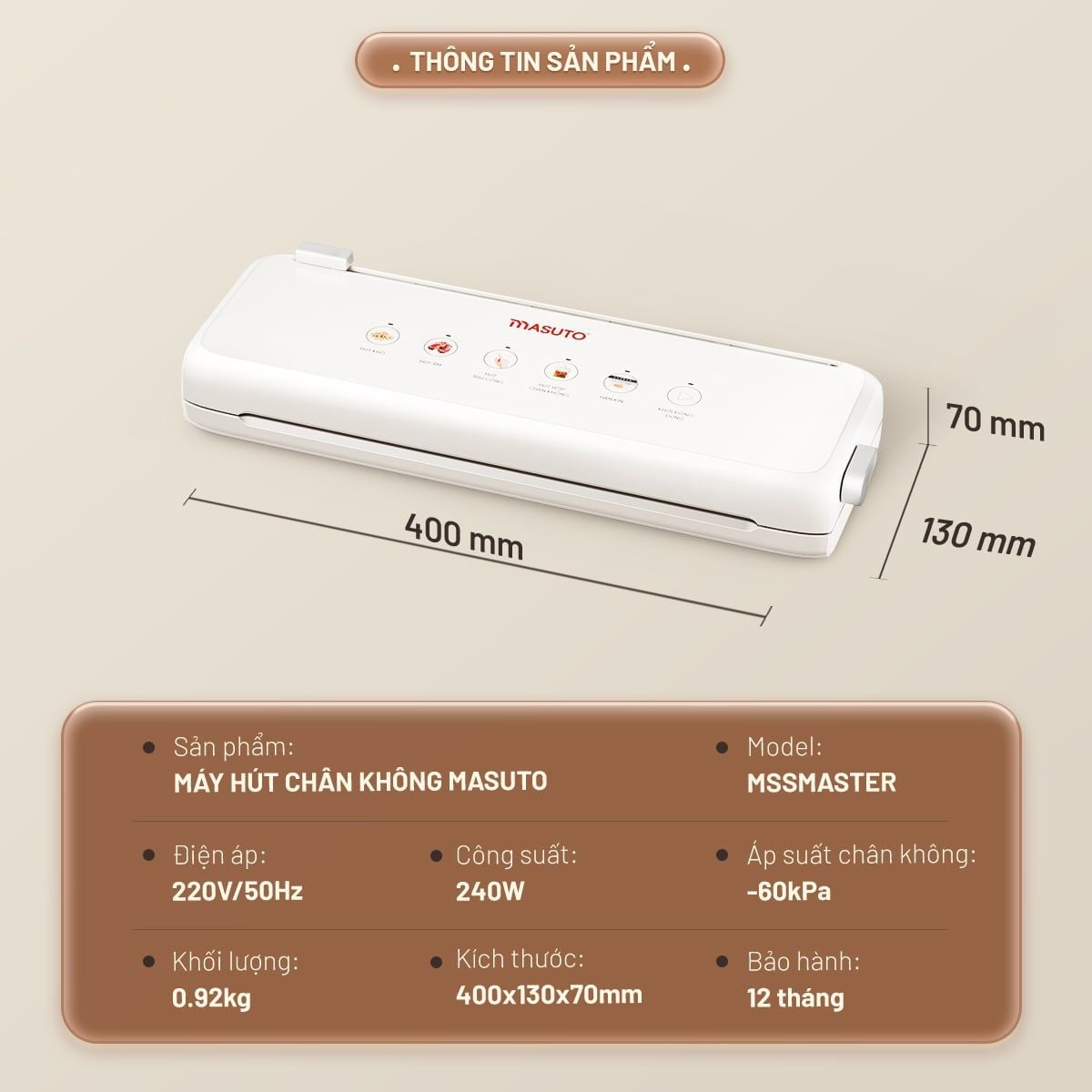 Mặc dù hoạt động với công suất cực lớn 240W, nhưng máy vận hành rất đầm chắc nhờ chân đế silicon chống trượt. Thiết kế này giúp máy bám chặt vào mặt bàn đá hoặc kính, triệt tiêu rung lắc và tiếng ồn, đảm bảo sự ổn định tuyệt đối trong quá trình hút. Sở hữu Masuto MSMASTER trong bếp, bạn không chỉ có một trợ thủ bảo quản thực phẩm đắc lực mà còn nâng tầm đẳng cấp cho không gian sống của gia đình.