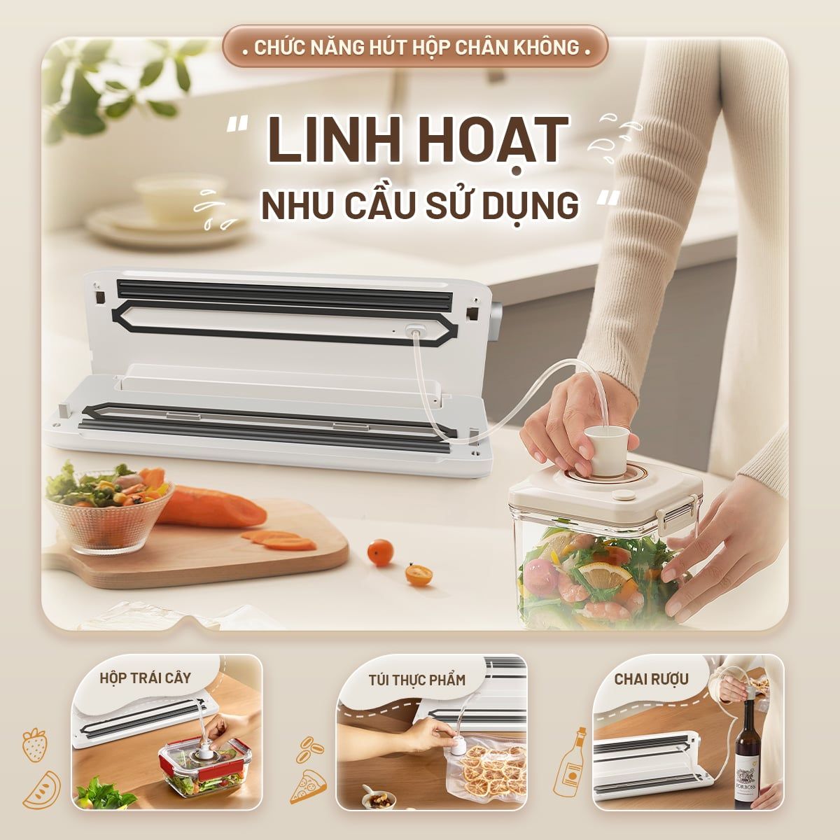 Hút chân không ngoài (Hút hộp chân không): Đi kèm dây hút tiện lợi, dễ dàng kết nối để hút chân không cho các hộp đựng thực phẩm chuyên dụng, lọ muối dưa hoặc bảo quản chai rượu vang dùng dở.